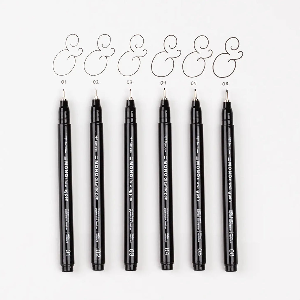 Water-based pigment ink drawing pens produce smooth, skip-free drawing and writing with no smudging. Ink is light resistant and dries instantly! Long metal nib allows for clear visibility when drawing. Excellent nib strength withstands firm pressure without bending tips, ensuring steady ink flow. Great for use with colored art markers and colored pencils. Produces excellent results when used with drawing, marker, watercolor and mixed media paper. Ideal for illustrations, technical drawings, manga, anime, lettering and journaling. Create precise, detailed drawings with 6 tip sizes – 01, 02, 03, 04, 05, 08.