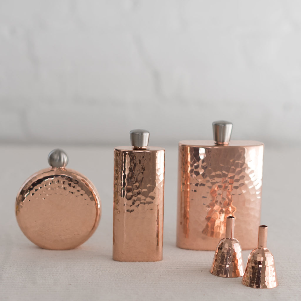 This is one serious flask. The size is generous and the weight is hefty. Handcrafted of gleaming hammered copper by artisans from Sierra Madre, Mexico, this vessel is lined in tin to safely store your favorite liquor. Our Grand Daddy flask will stand tall and proud on your bar. We include a matching copper funnel for easy filling. Capacity 350 mLs or 12 oz.