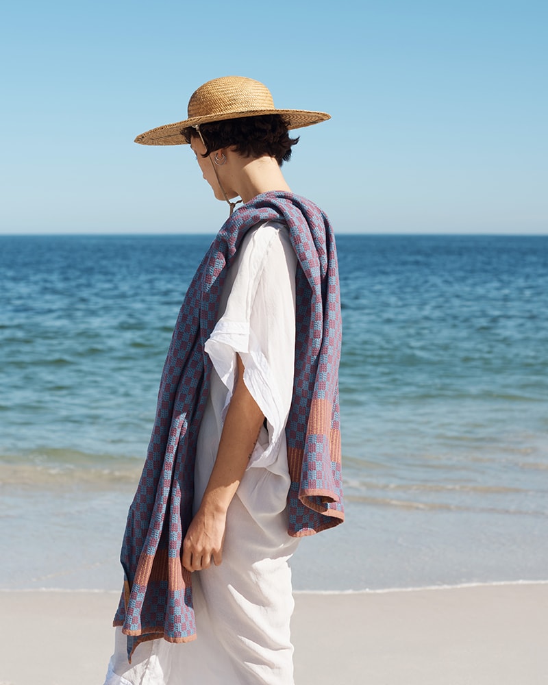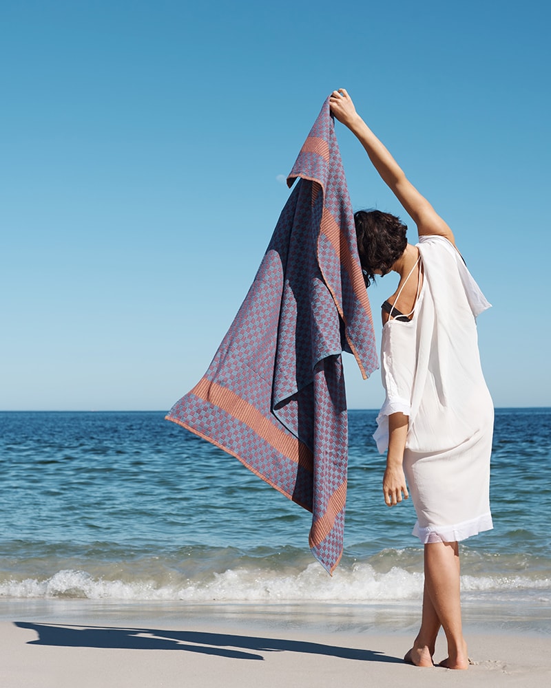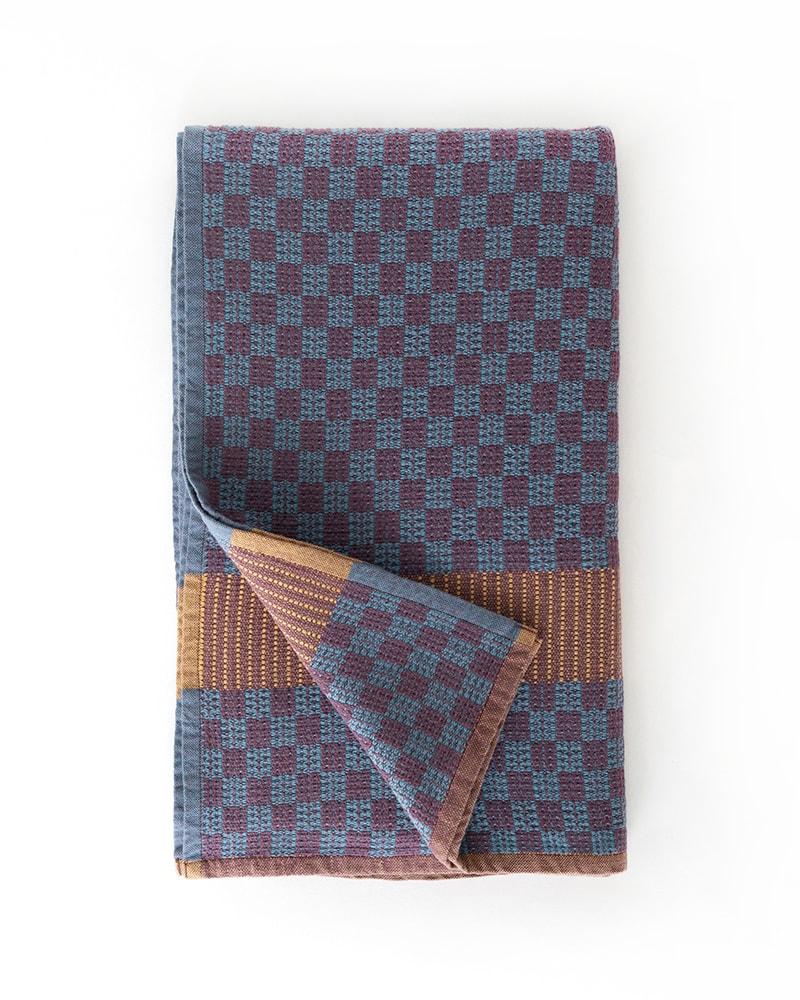 A colorful cotton beach towel with a unique checkerboard design. Woven with a traditional pattern that has been used for toweling long before the mass production of the terry towel.