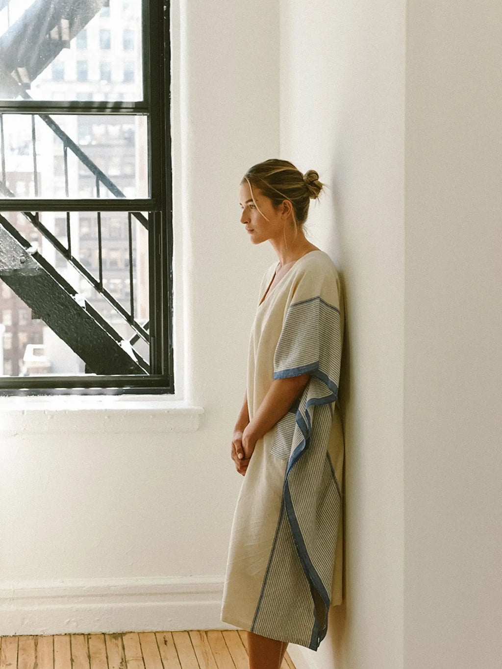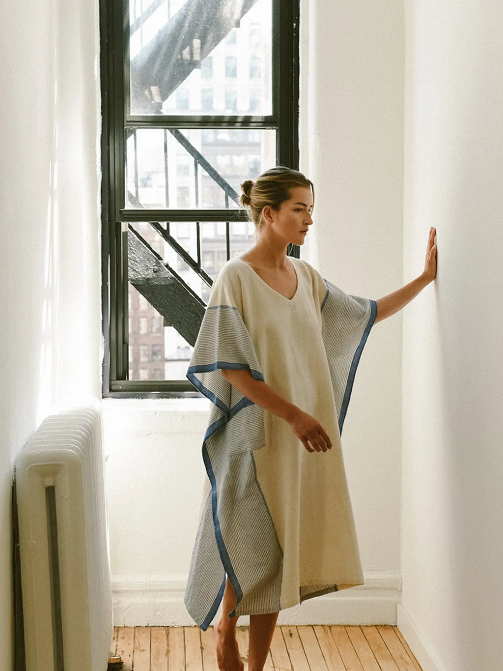Crafted on the coast of Turkey, our Ivory Blue Tribeca V-Neck Kaftan is hand loomed using traditional techniques and woven with 100% premium Turkish cotton. Similar to a Turkish towel, it is highly absorbent, lightweight, eco-friendly, and quick to dry. A beautifully breezy loose fitting dress that will perfectly compliment your seaside apparel. Experience how your kaftan becomes softer and better with each and every wash!