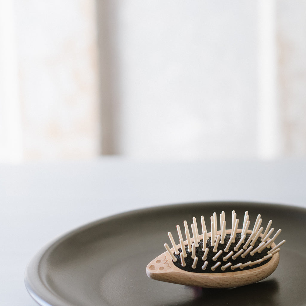 Cute, curved, hedgehod-shaped handle comfortably contours the palm. Each maplewood pin is enrobed a waxy, environmentally-friendly coating that glides through knots and tangles. Narrow pins provide pleasant scalp care, pampering coarse, fine, or brittle hair; unlike metal or plastic, Redecker's wooden pins are anti-static and non-conductive.