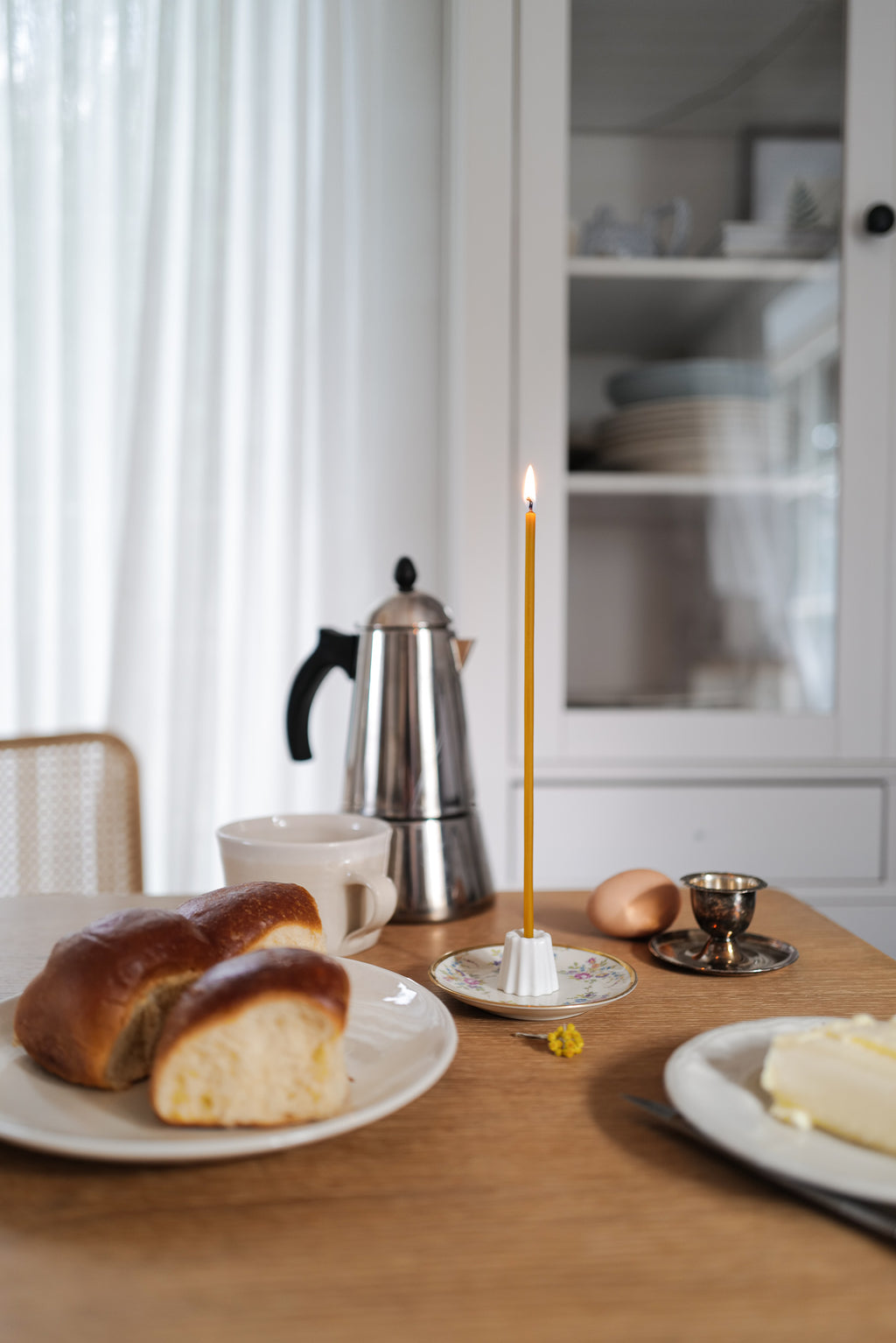 Handcrafted candle holder from porcelain for thin (0,5 cm diameter) candles. Holders come in glossy white, matte white, blueish grey or glossy green glaze.