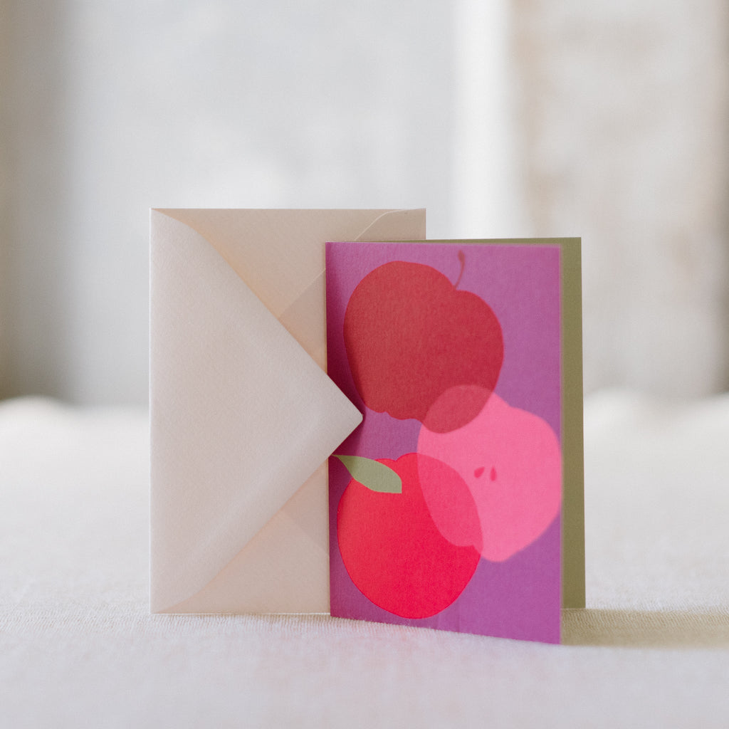 In these days of digital, to offer a hand-written card is a truly special gesture. Local Swiss fruits were illustrated by hand and set in bright colours to form a delicious collection of seasonal produce. You'll find a cool splash of colour on the inside.
