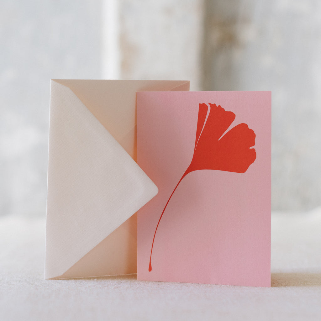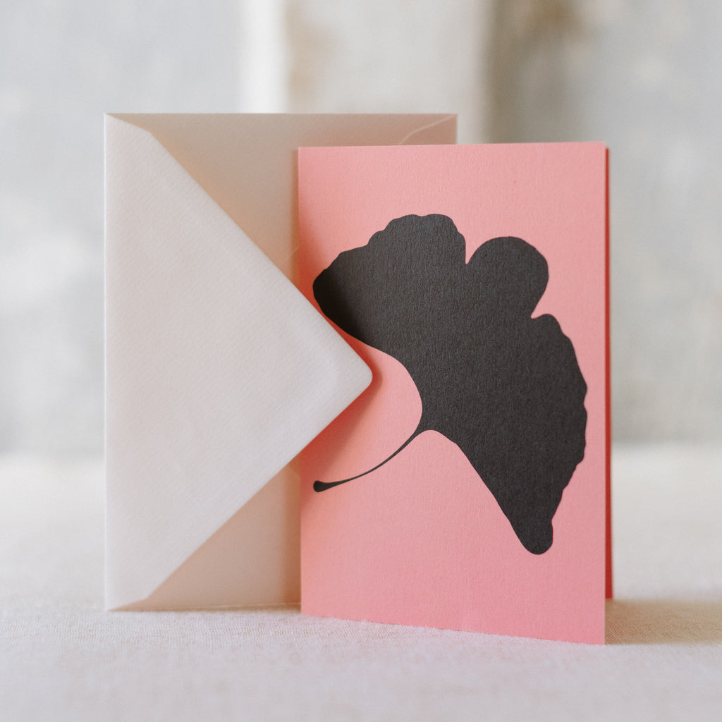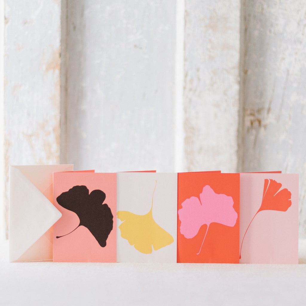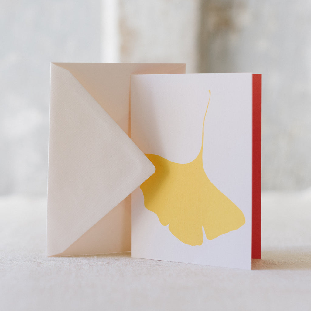 Found Ginkgo leaves were carefully drawn by hand and set in unexpected colors that pop! You'll find a surprise splash of bright colour on the inside.