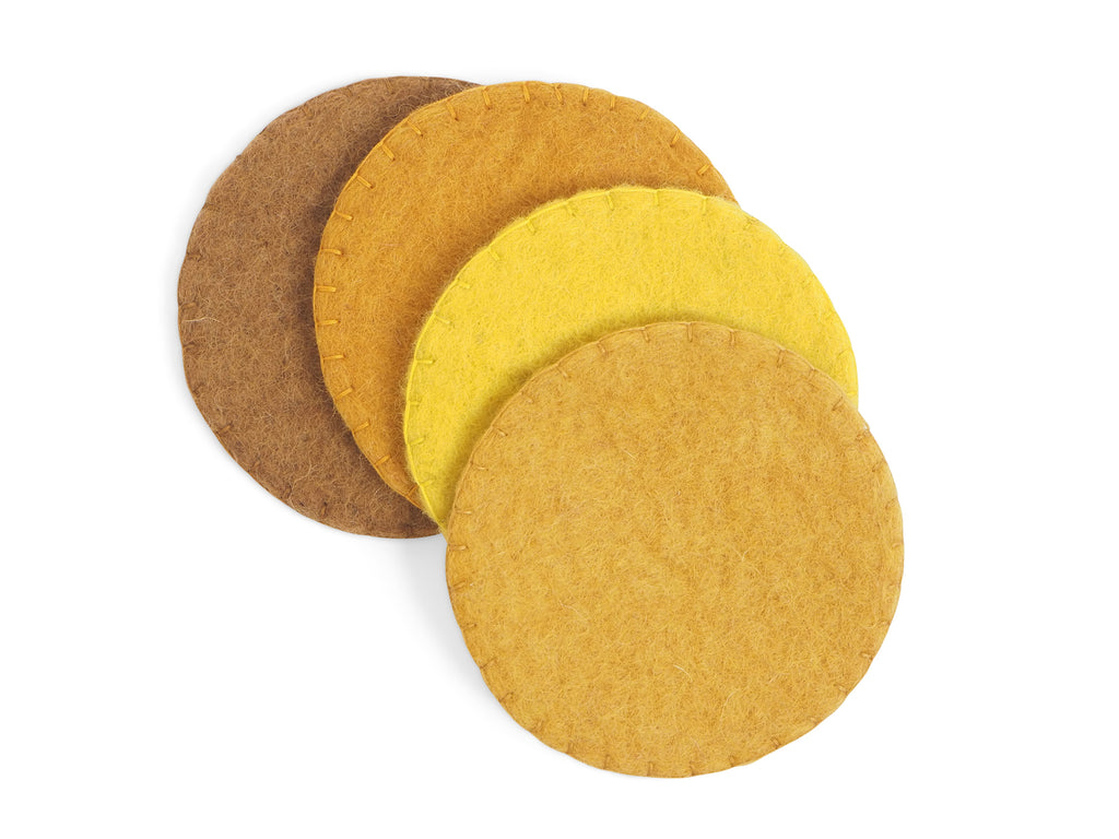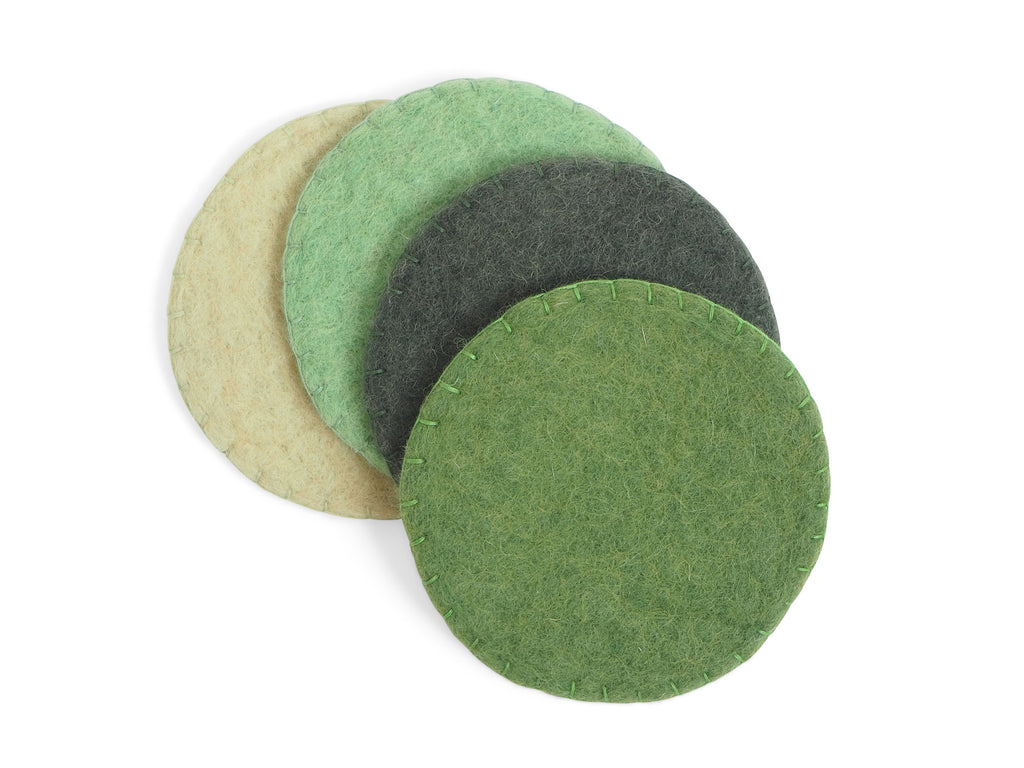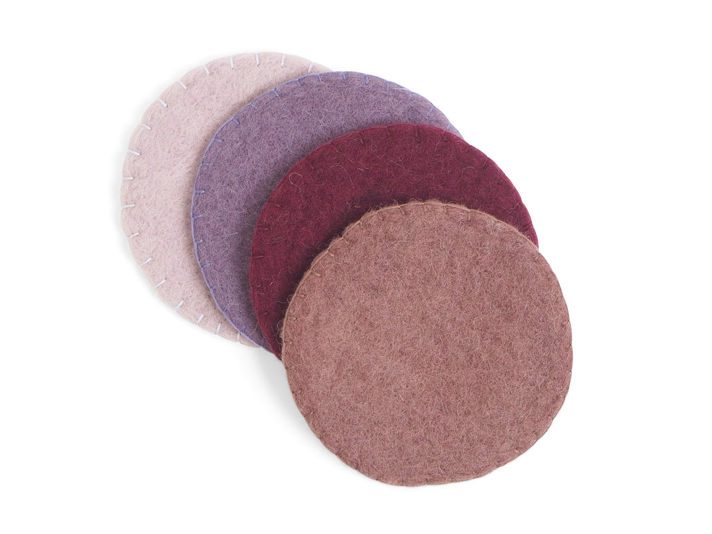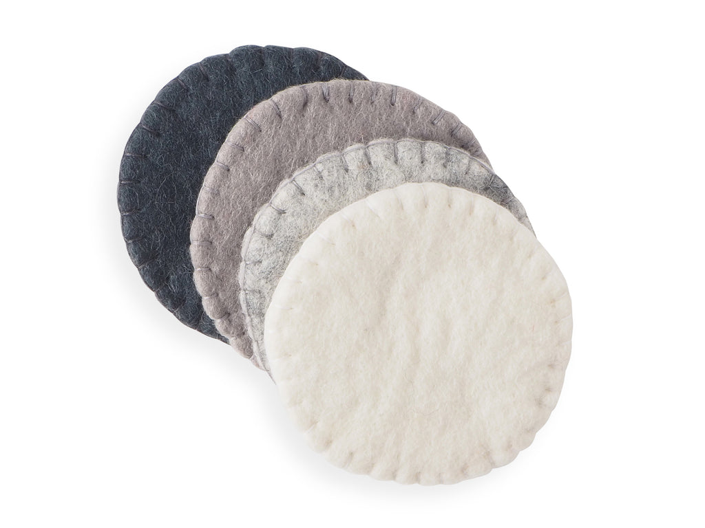 Four wool coasters that are handmade and come in natural colors to protect your surfaces.