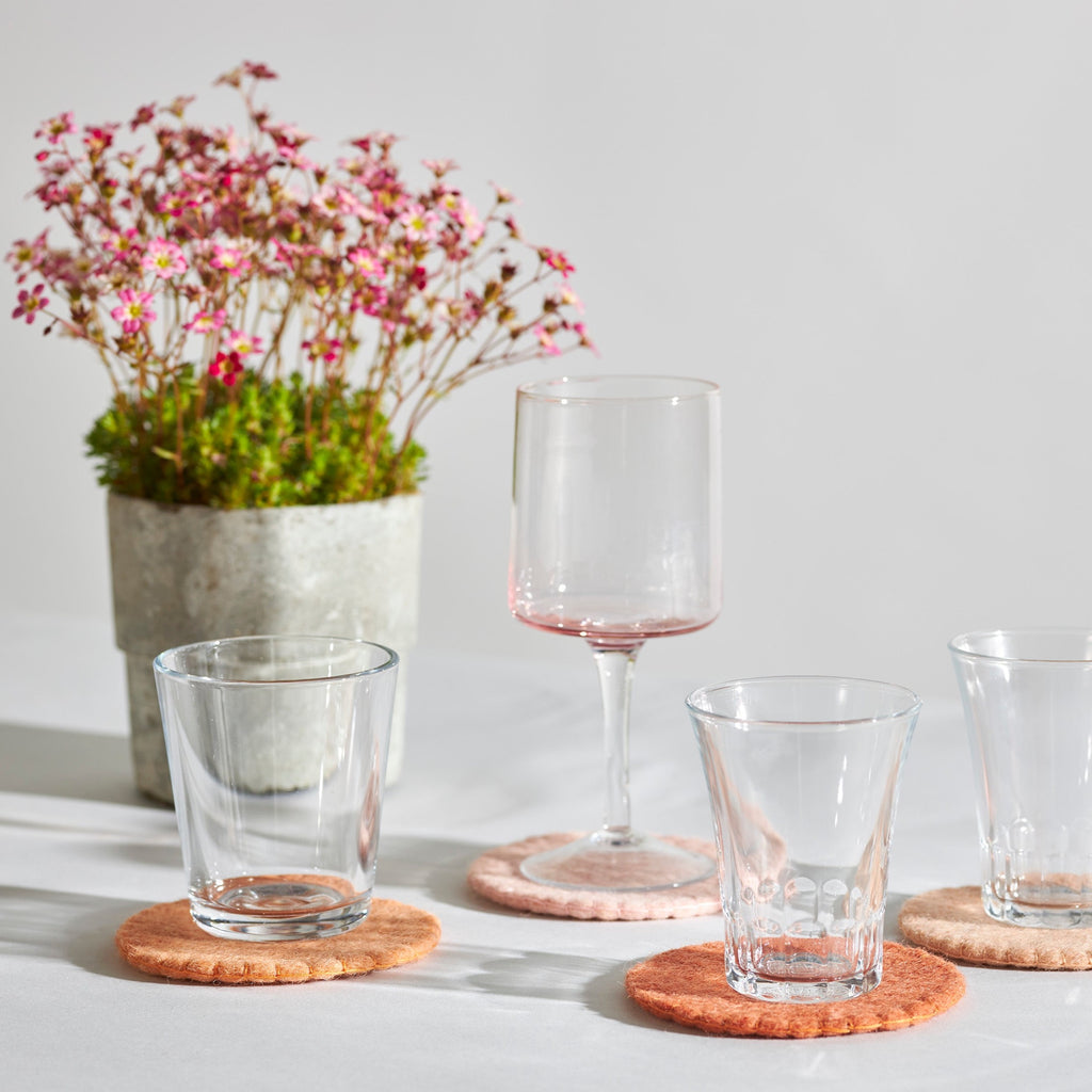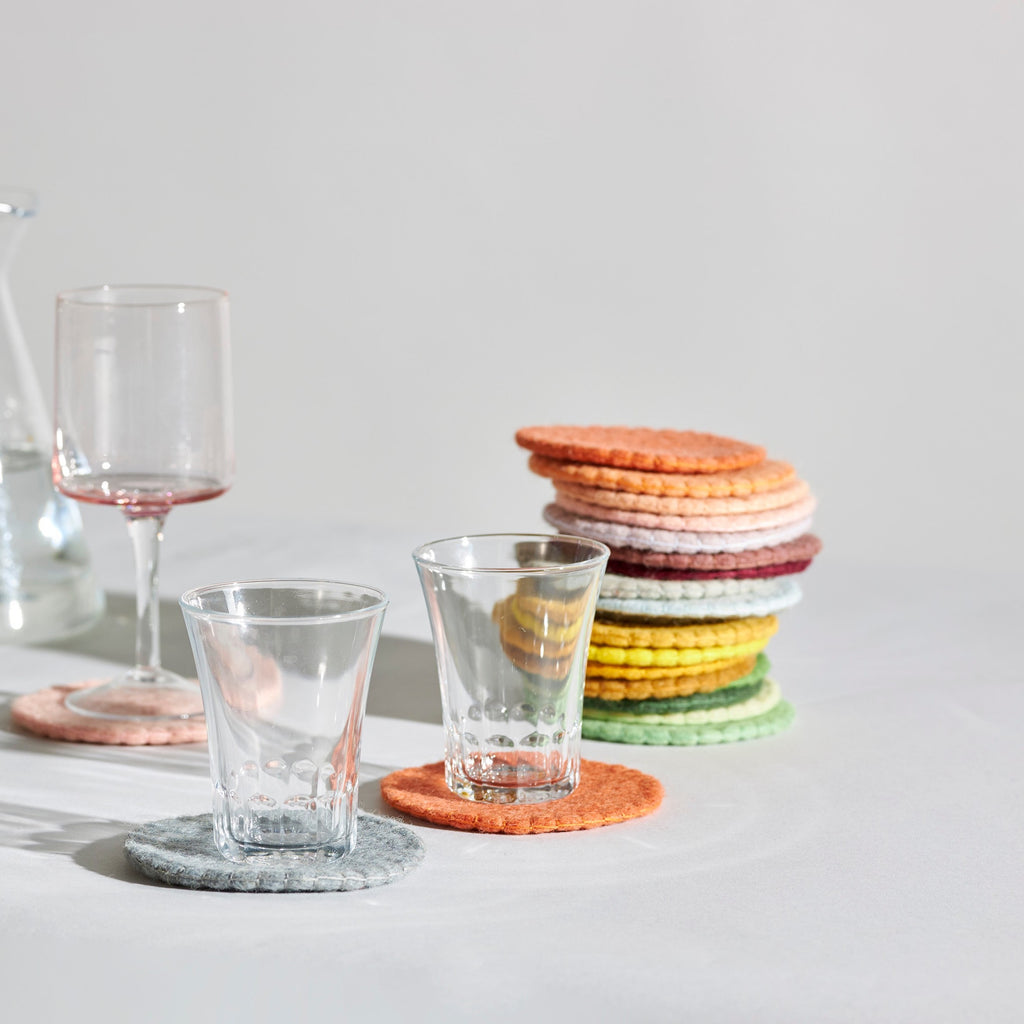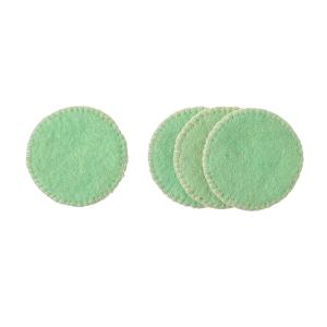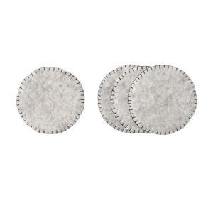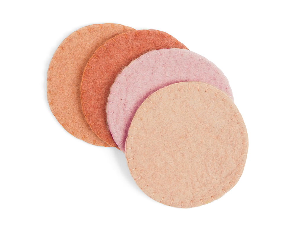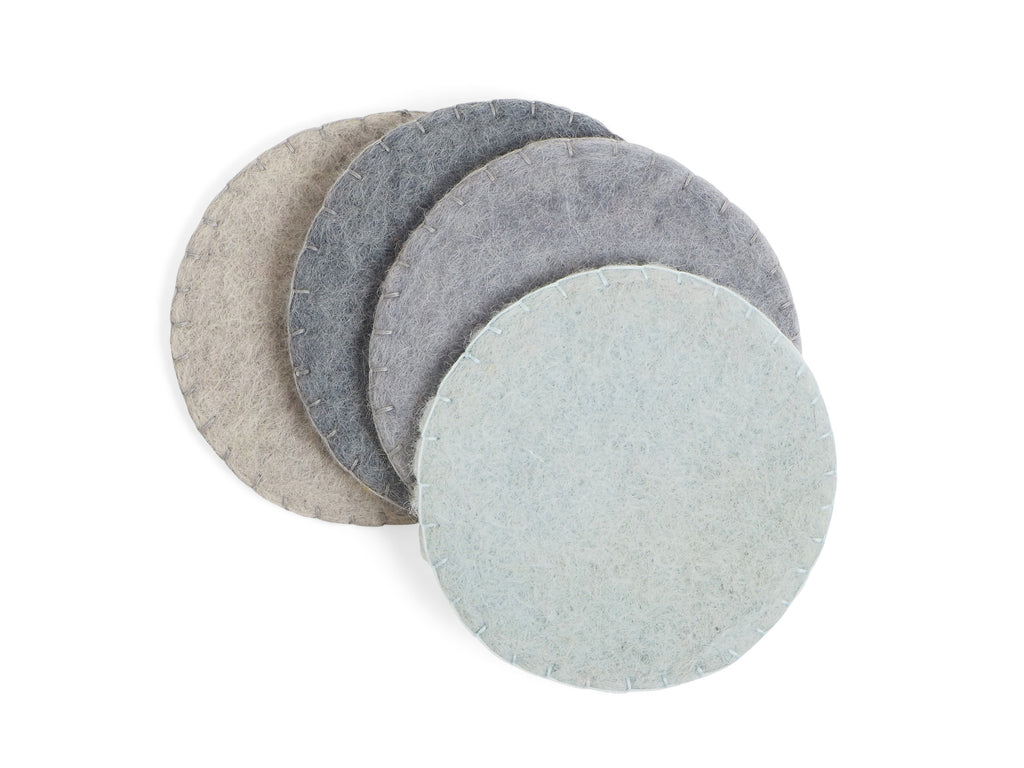 Four wool coasters that are handmade and come in natural colors to protect your surfaces.
