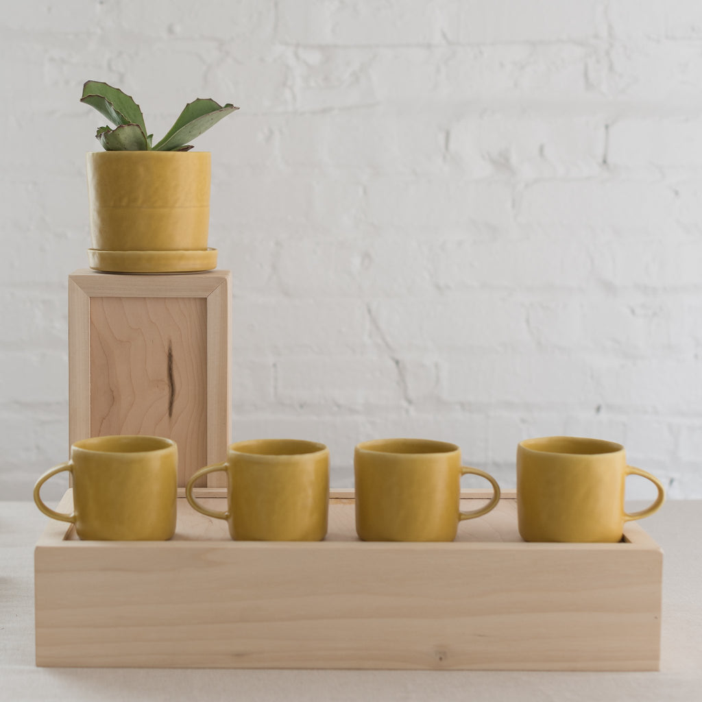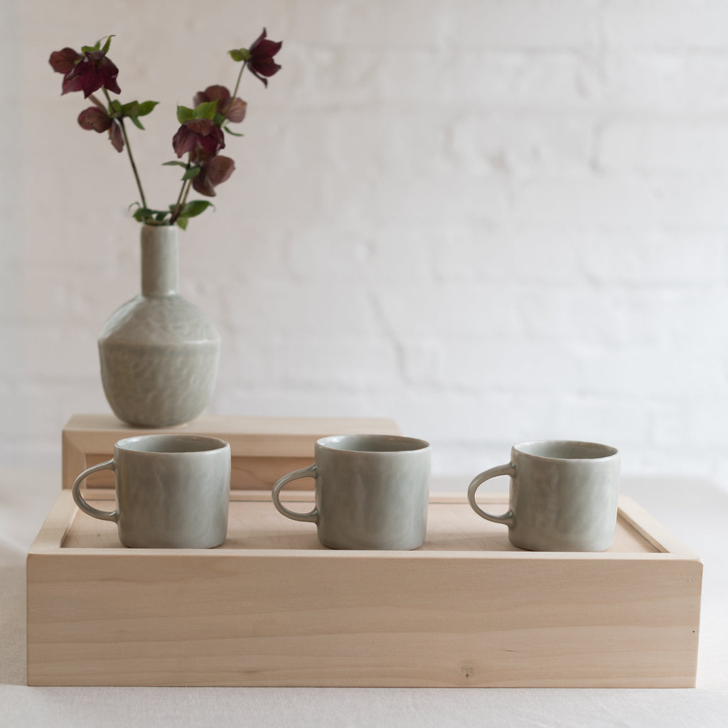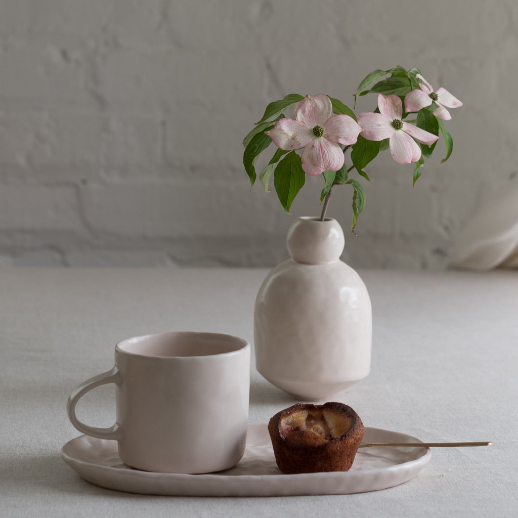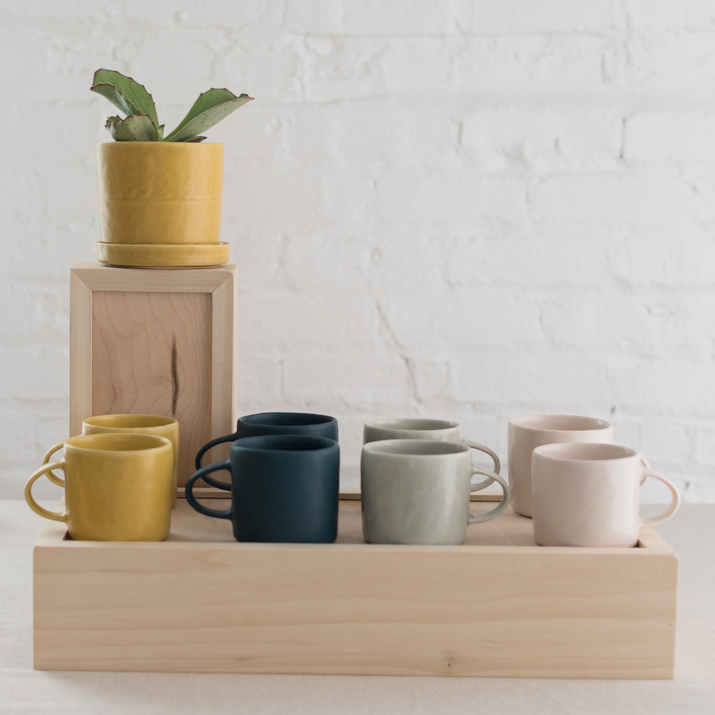 Fill your morning ritual with your new favorite mug. Choose from a variety of satin matte glaze options. Mix and match to create a fun new collection. The mug was pinched from porcelain clay revealing the finger impression. It is dipped in a satin matte glaze and is suitable for the everyday.