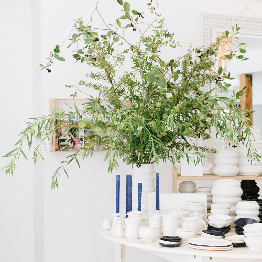 Make a statement with or without the flowers. Crafted exclusively for us, our modern vases featured a series of sturdy rings spun together to form a one-of-a-kind shape that feels as good as it looks. Available in glossy white or navy. Each piece is unique and size varies.