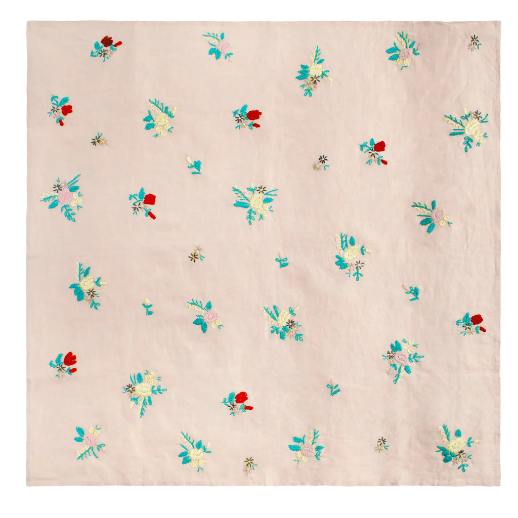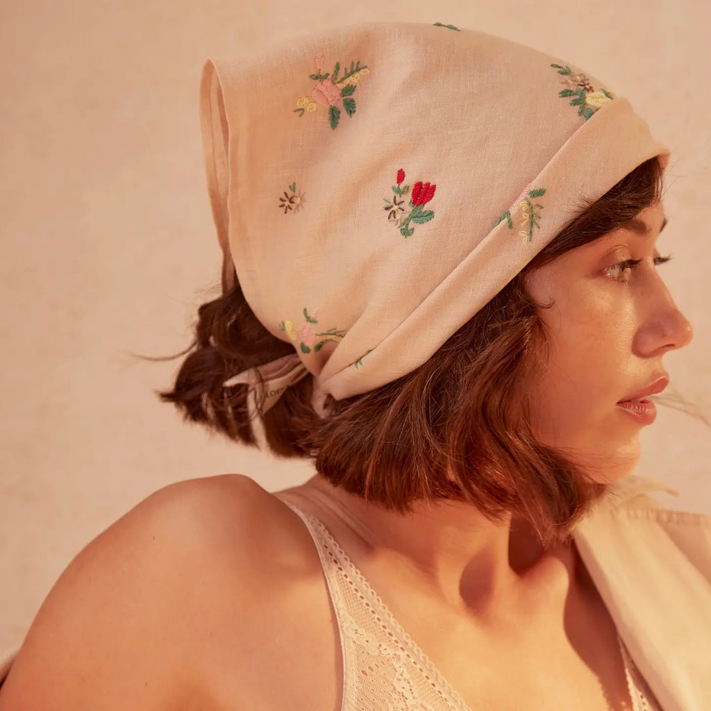 Introducing our Èze Kerchief, crafted with 100% Italian Linen and adorned with a charming vintage floral hand embroidery. Skillfully crafted by our artisans, the delicate bouquets are made from 100% cotton threads. Wear it as a head scarf, a ponytail or bun bow, a headband, or a neckerchief - our versatile Kerchiefs are perfect for any occasion. And because they're handcrafted in small batches, each one has its unique shade. Please note that colors may appear differently on your device.