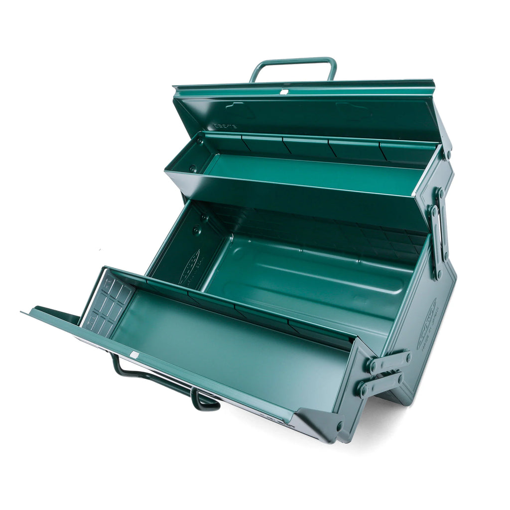 Steel toolbox with cantilever lid, two upper storage trays with adjustable and removable dividers and hole for a padlock. Use for art supplies, make-up, medical supplies, snacks or tea - the possibilities are endless.