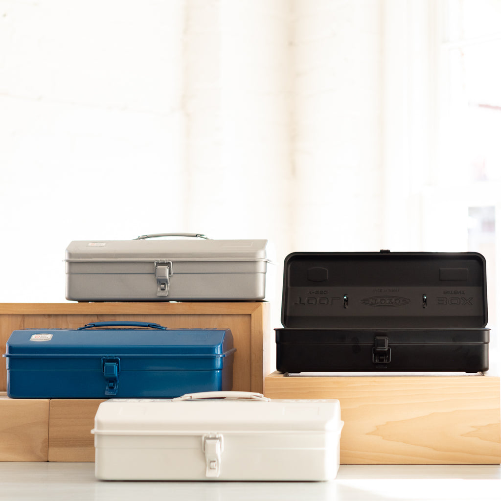Camber: Steel toolbox with camber lid and top extendable handle. Produced from one piece of steel, resulting in water-tightness, no sharp edges and unmatched strength. Use for tools, art supplies, make-up - the possibilities are endless!