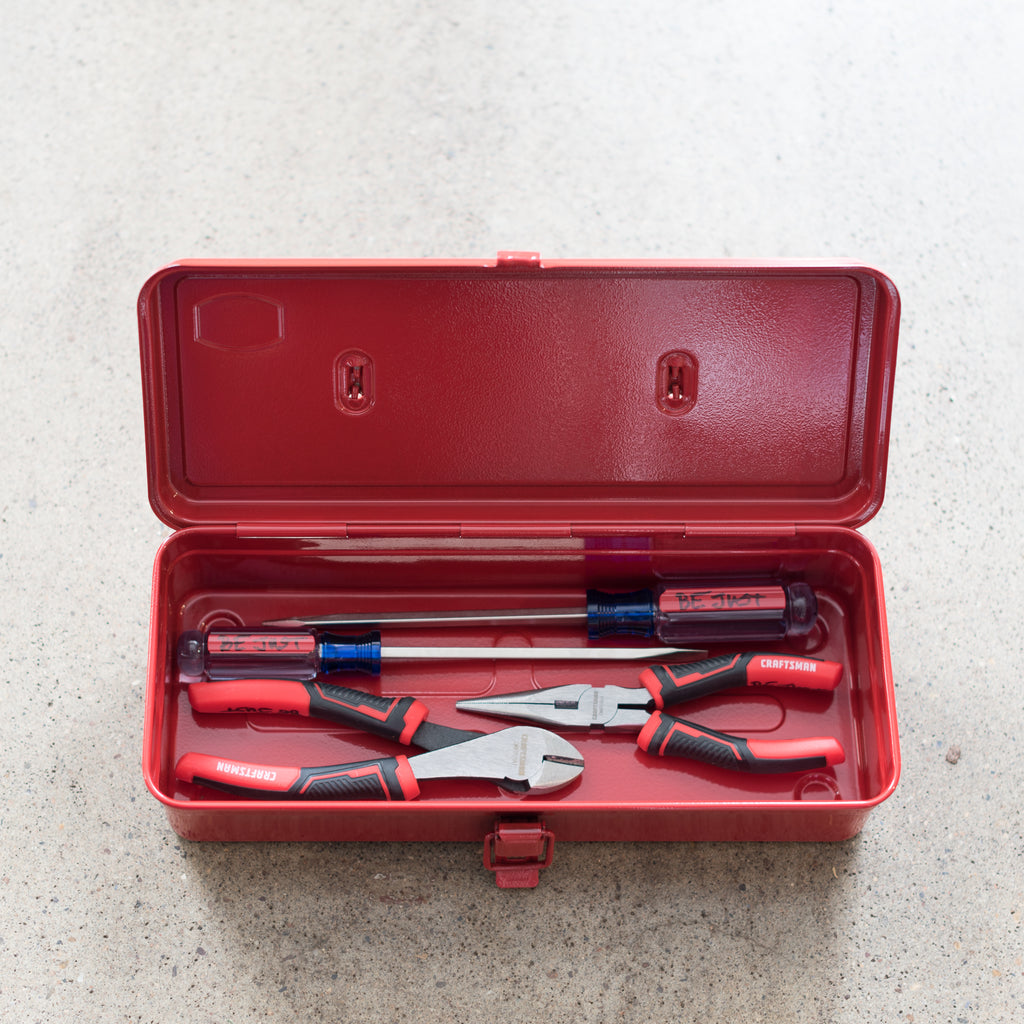 Flat:Steel toolbox with flat lid and top extendable handle. Produced from one piece of steel, resulting in water-tightness, no sharp edges and unmatched strength. Use for tools, art supplies, make-up - the possibilities are endless!