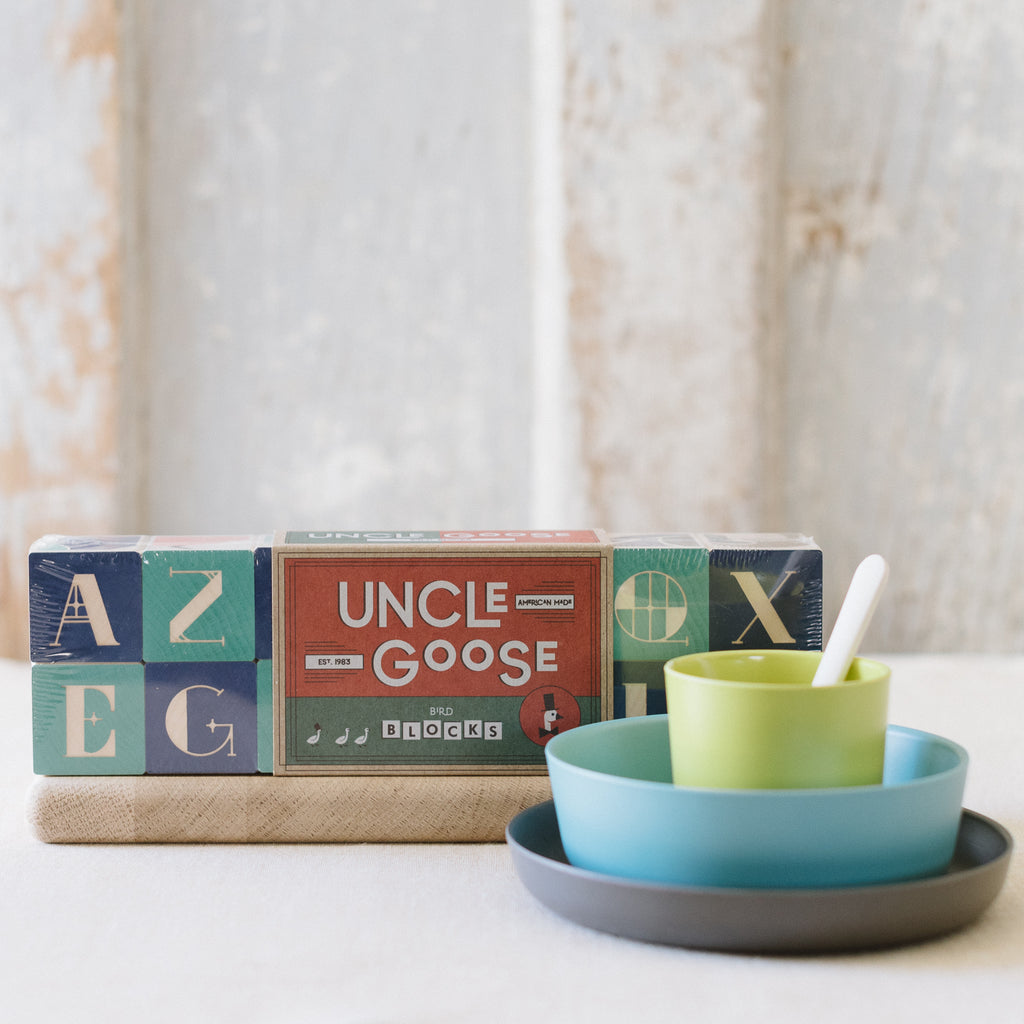 One side of each block reveals a close up of the bird featured on its opposite. Colorful Art Nouveau letters grace the remaining sides. Two debossed letters on each block.