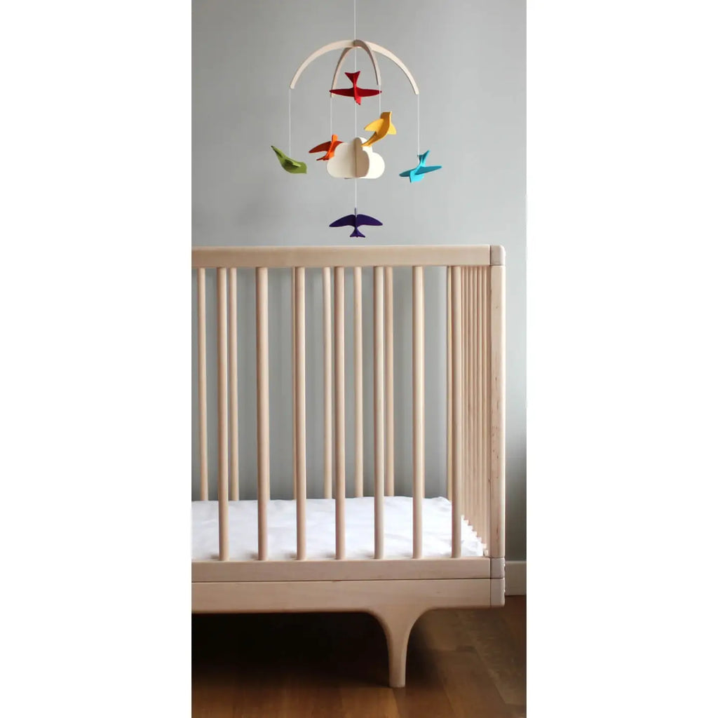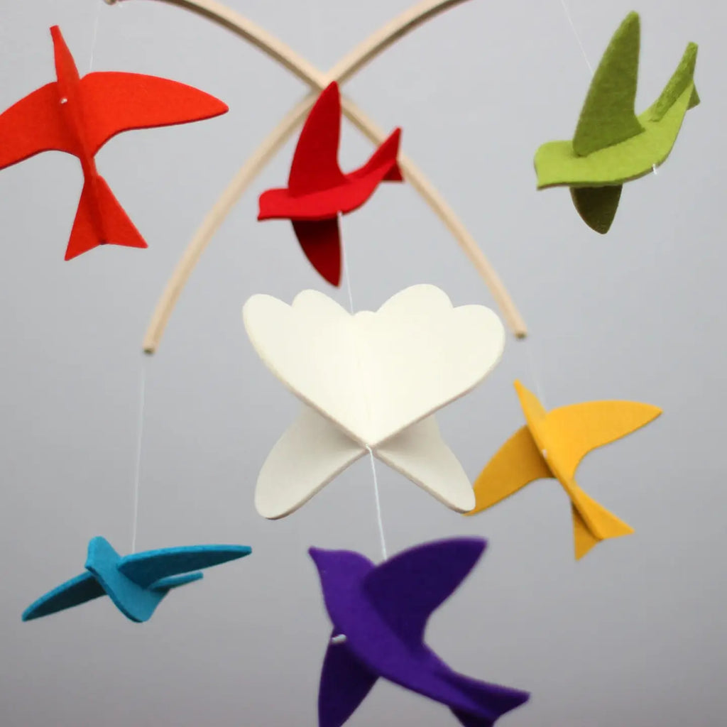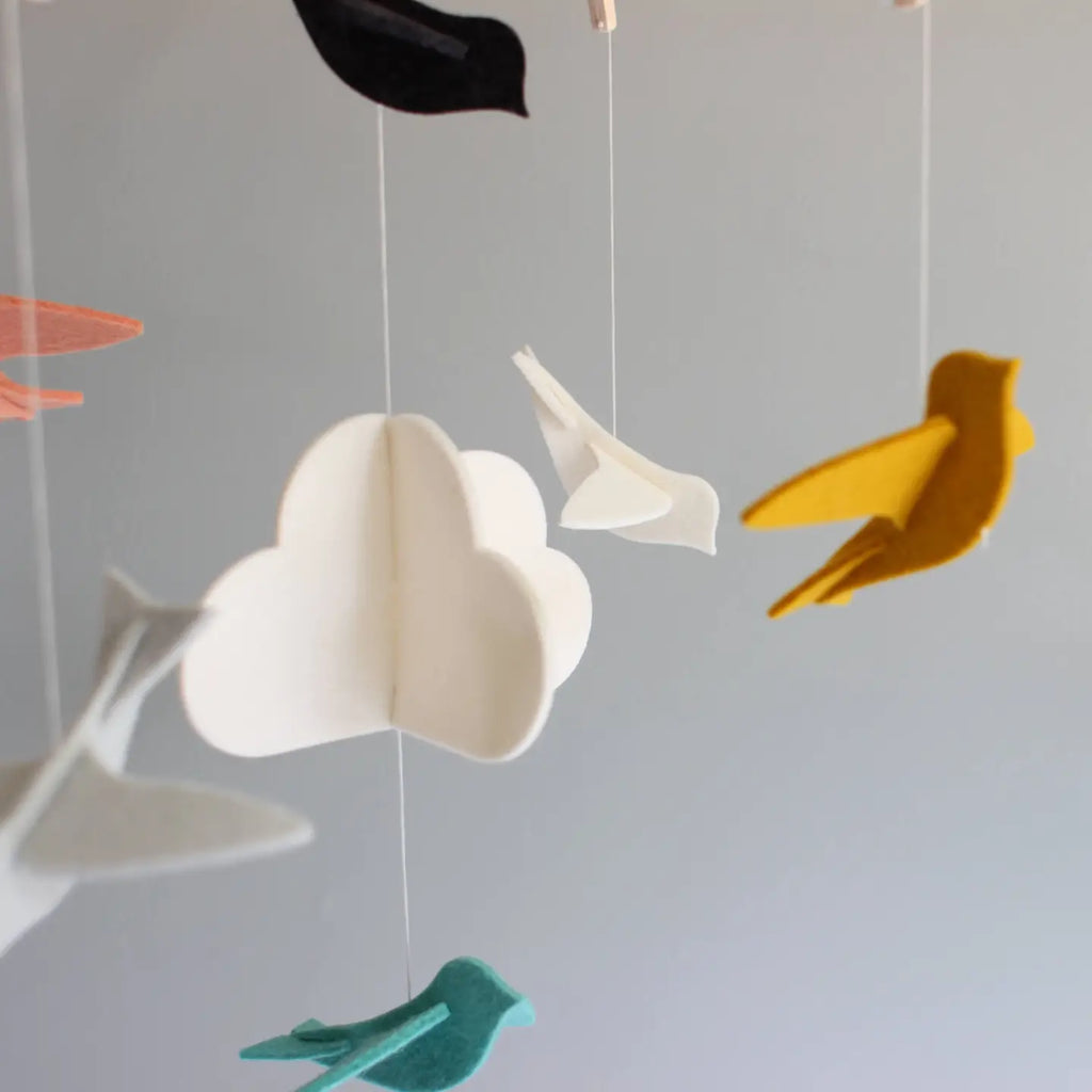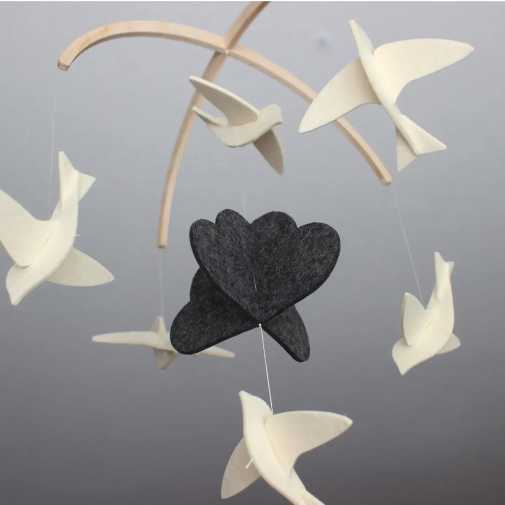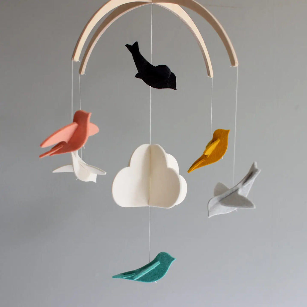 Delicately balanced and beautifully crafted, this Bird Mobile brings a touch of nature-inspired charm to any space. Featuring graceful, lightweight birds in flight, this mobile moves gently with the air, creating a soothing, dynamic display. Whether hung in a nursery, living area, or workspace, its elegant design adds warmth and whimsy to your décor.