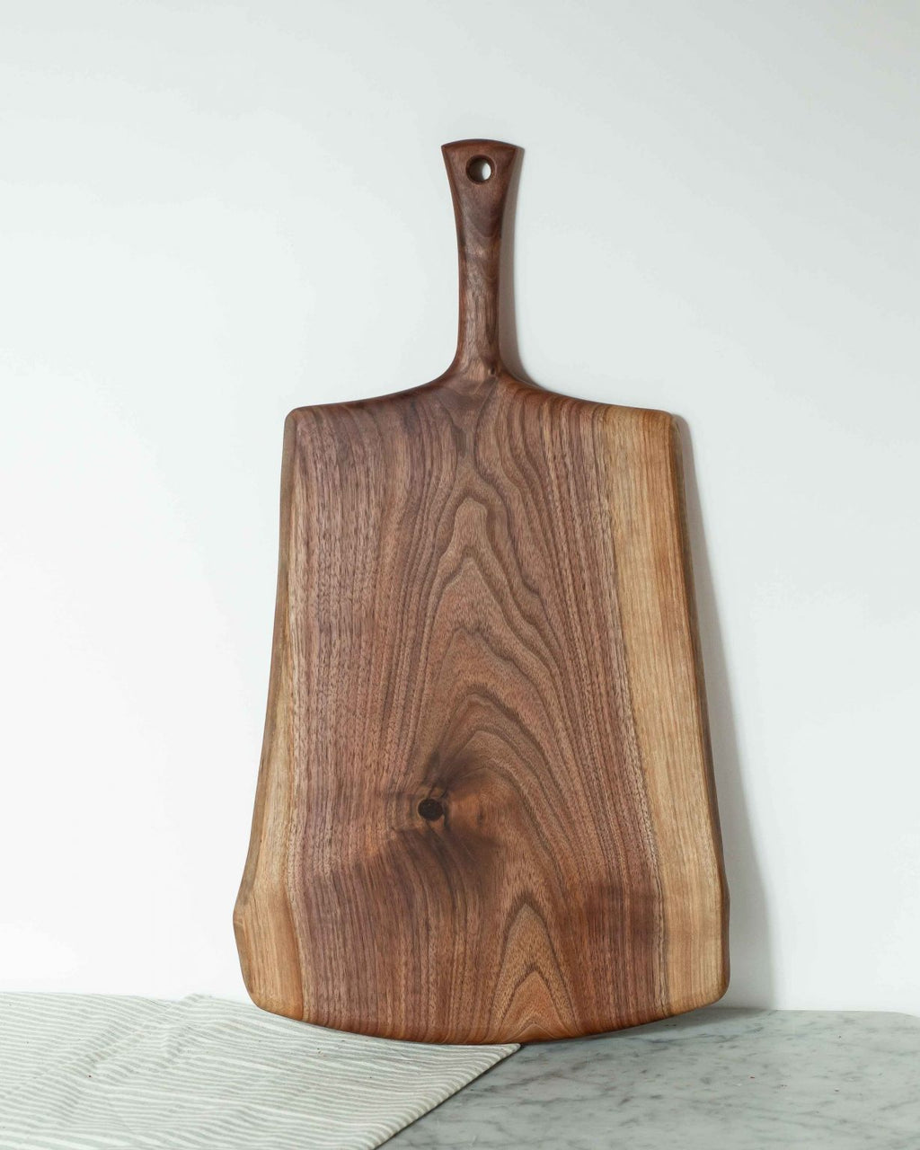Our handled serving boards are functional for cutting but beautiful enough to hang on your wall when not in use. We suggest cutting on one size and serving on the other. These cutting boards make a beautiful platter for charcuterie, cheese and appetizers.