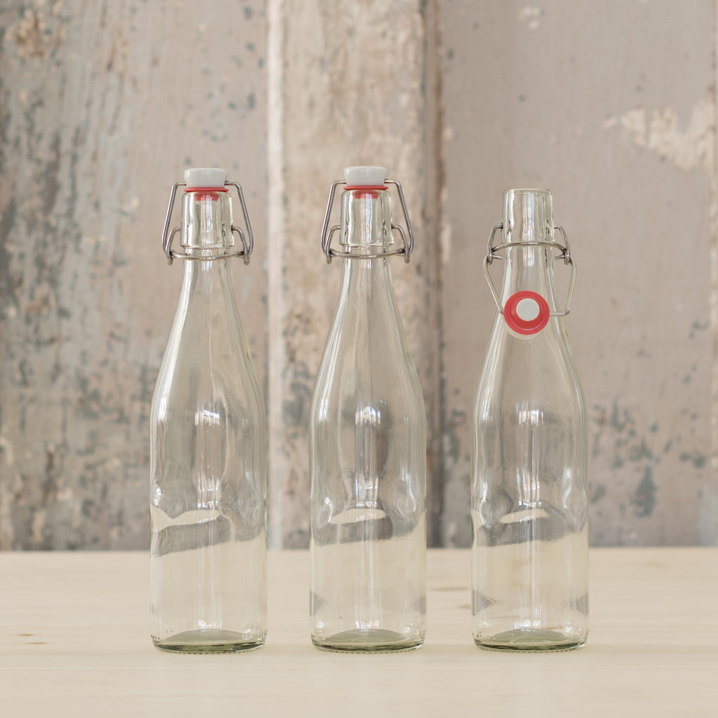 Printed logo swing top or metal twist lid, 100% recyclable, durable glass.
