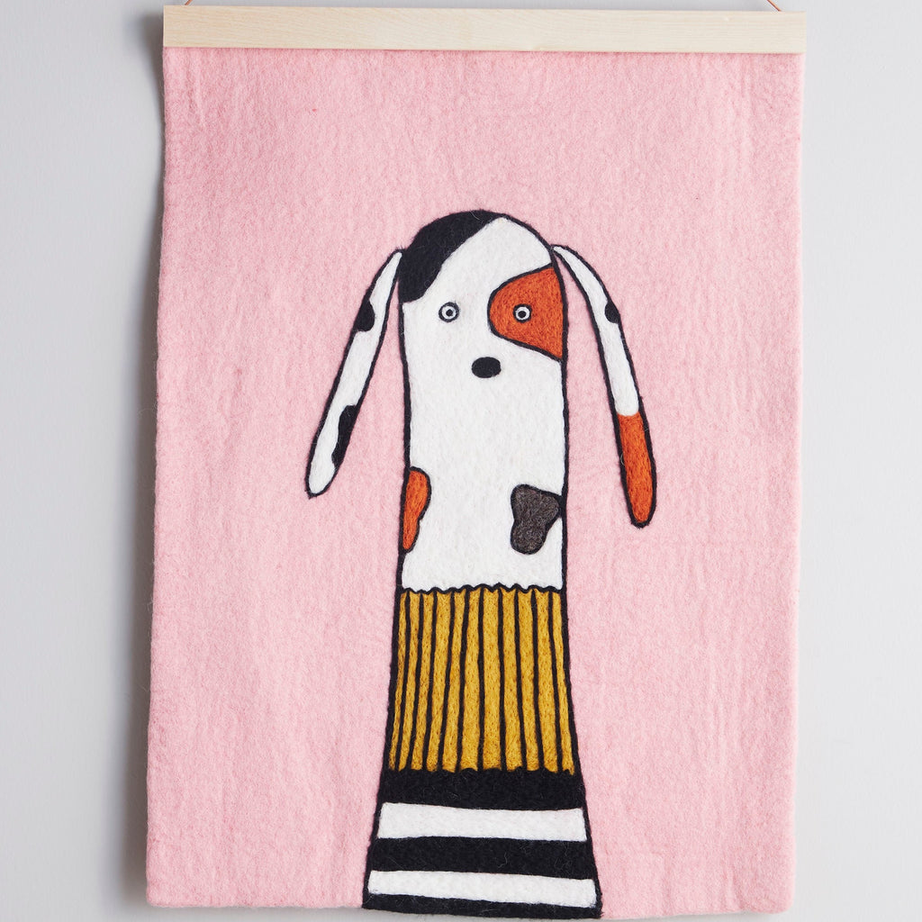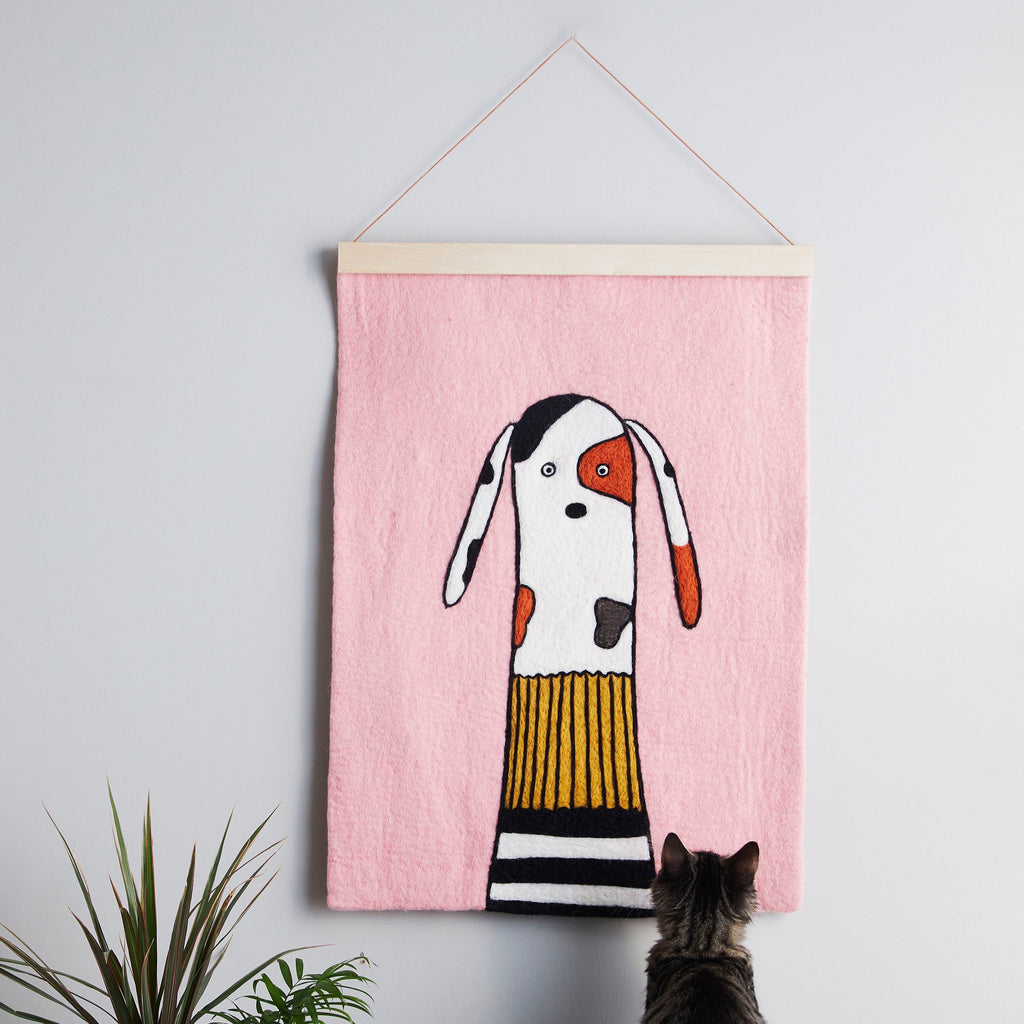Happy and friendly dog, just waiting with patience. In a pink room. Felted by hand in natural, azo-free colors. Made from soft, absorbent wool, this decorative wall hanging will help to dampen the sound in the room and bring a wonderful sense of happiness and joy.