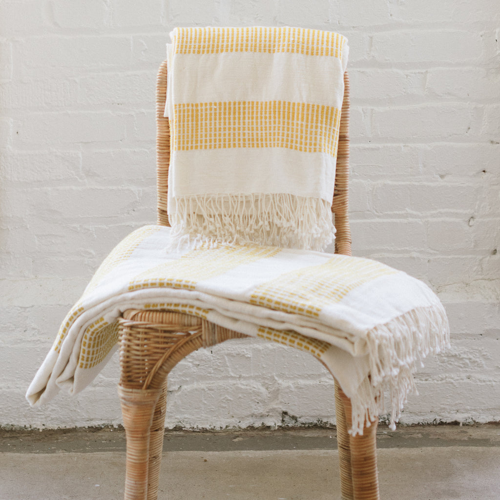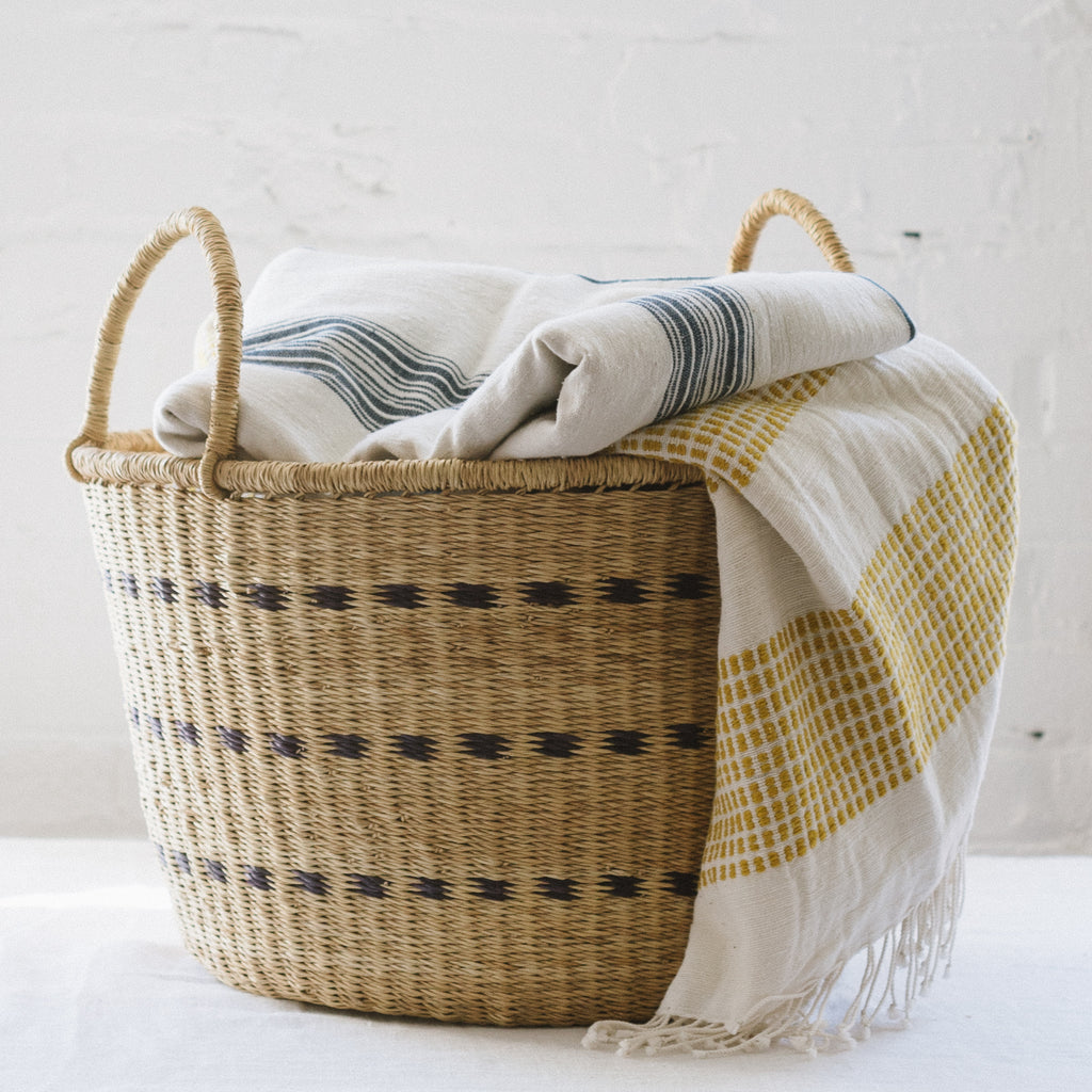 This versatile, lightweight queen blanket showcases the best in luxury bedding. Each piece is meticulously hand-woven in Ethiopia and features a bold color-blocked dotted pattern. Three separate panels are then bound together using traditional stitching techniques. Hand-spun Ethiopian cotton offers a uniquely rich texture that will continue to soften with each wash and dry.