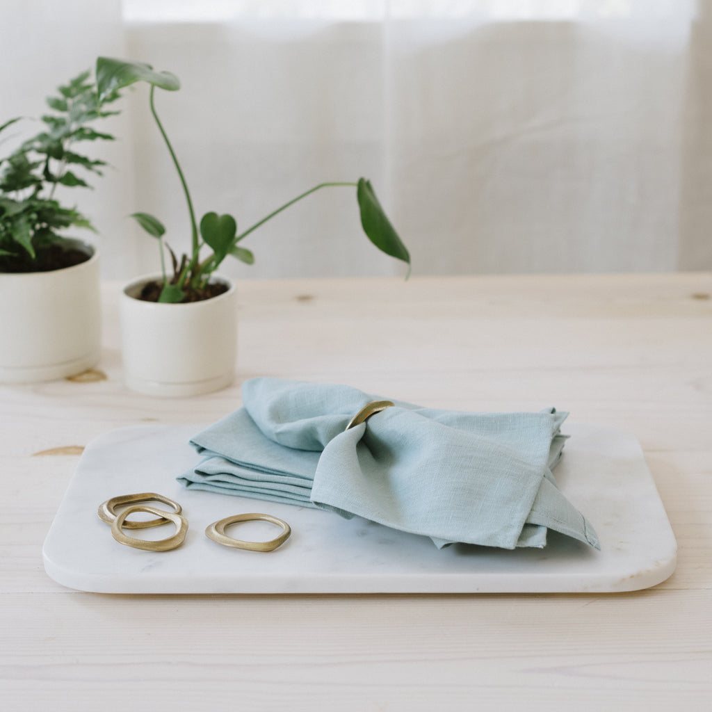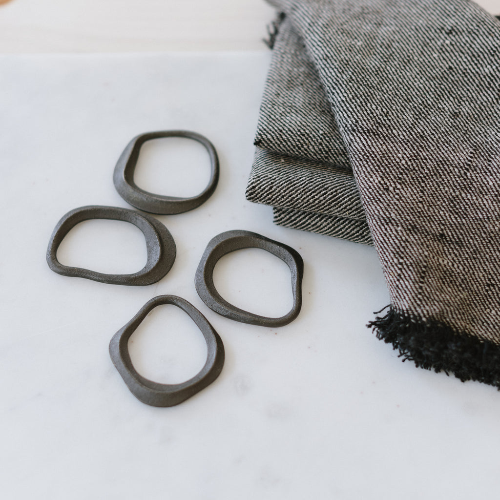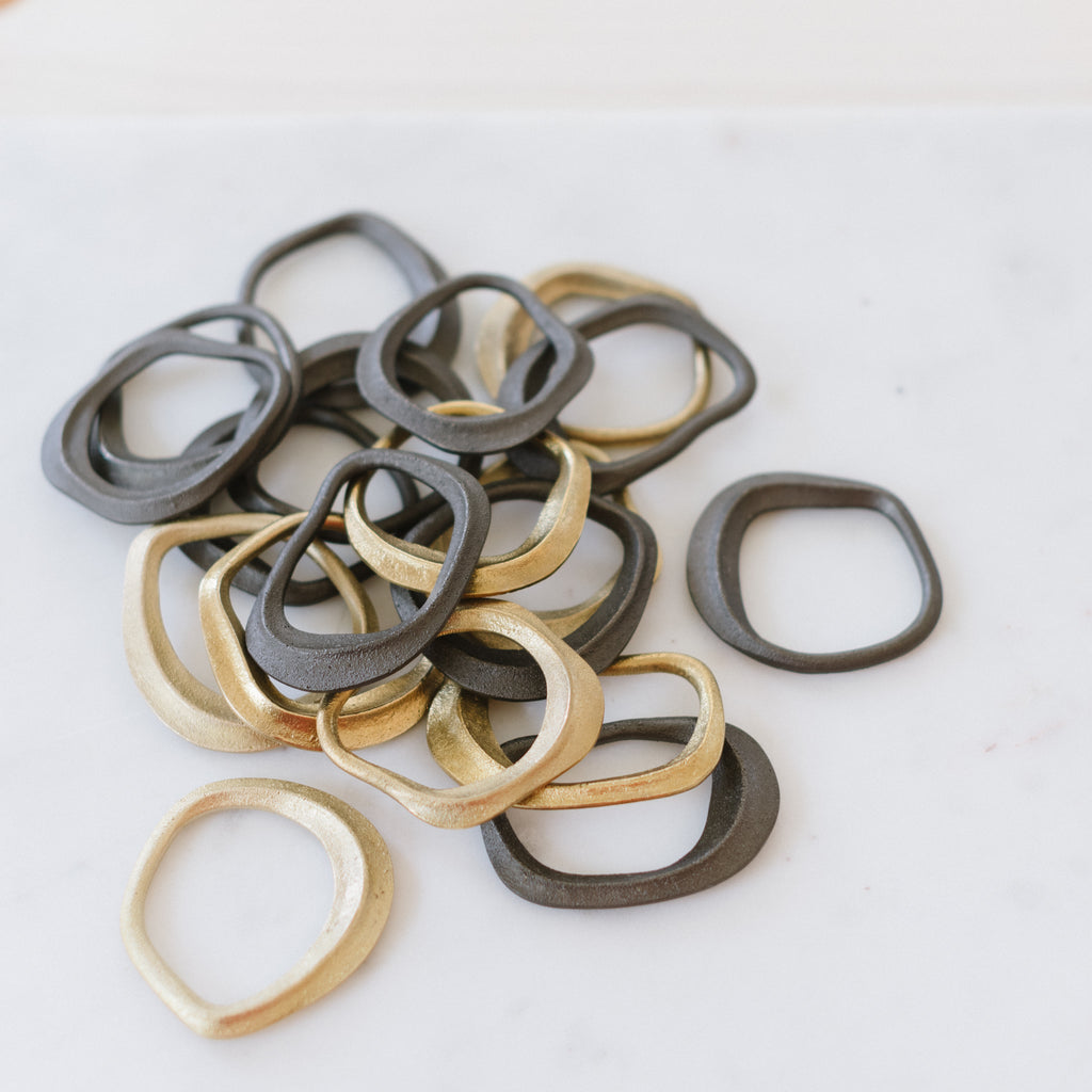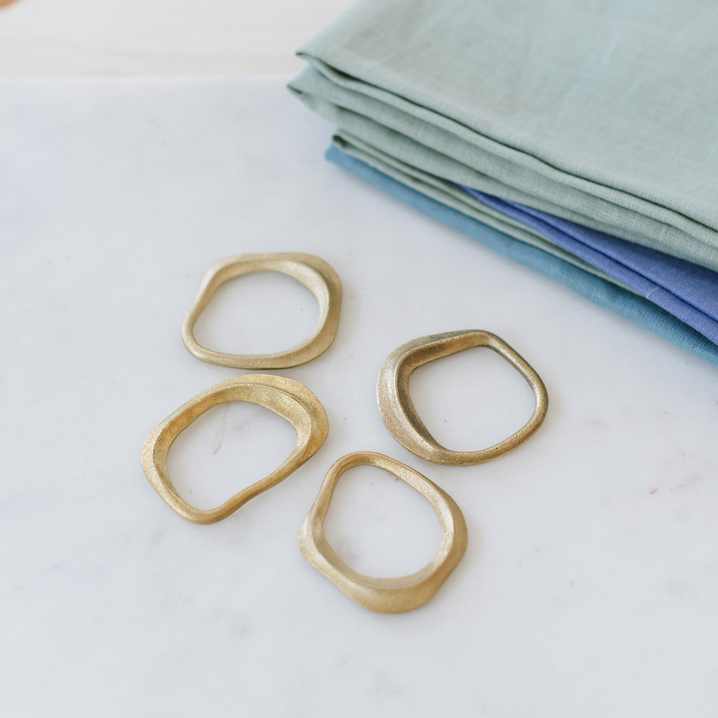 Molded into flowing, organic shapes, this set of four napkin rings help you set your table with the beautiful lines found in nature. Each set features four individually shaped rings of solid brass and presents a napkin casually, yet gracefully.