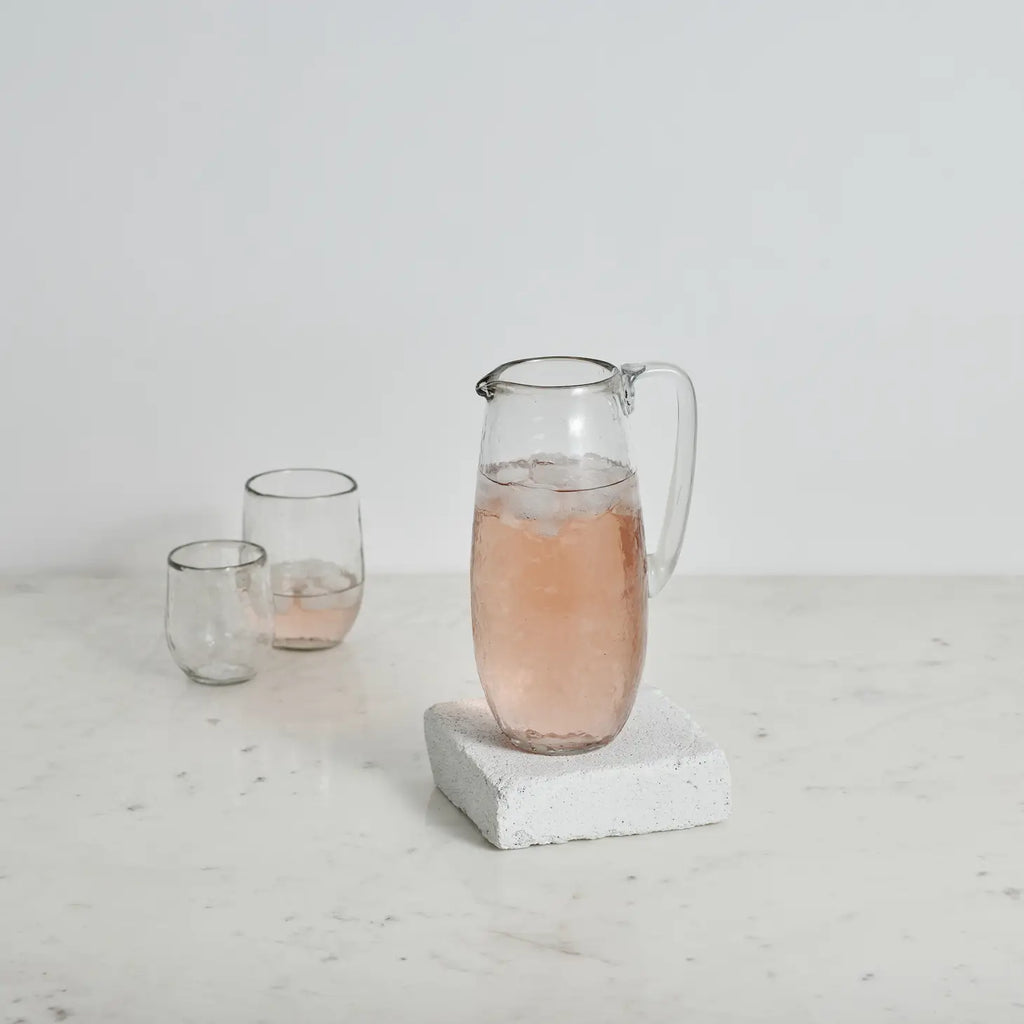 Perfect for dining al fresco, our new Pebbled Glass Pitcher is a tall drink of water! Partially made from recycled glass, this simple, hand-blown vessel features the same slightly hammered texture as the other pieces in the collection. Its slim silhouette is deceptively roomy, with an impressive 48 oz. capacity. This polished, versatile piece looks at home in any decor, at any meal, whether used with our Pebbled Glassware or not.