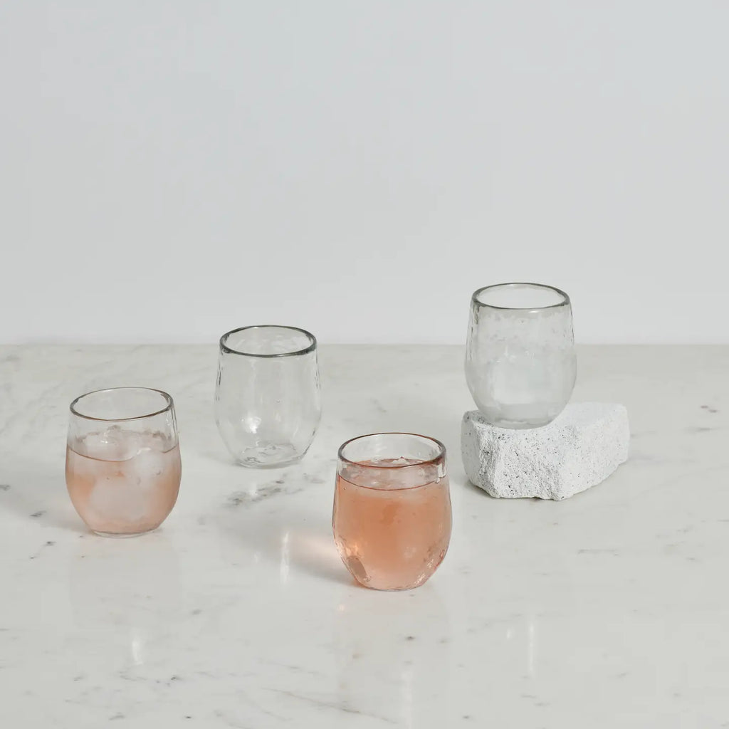 With their flared bowls and thick, short stems, these sturdy goblets are safe vessels for your favorite beverages. Made from partially recycled glass, their gently hammered texture and faint greenish color set them apart from typical stemware. 8.5 oz capacity