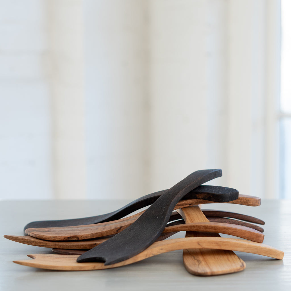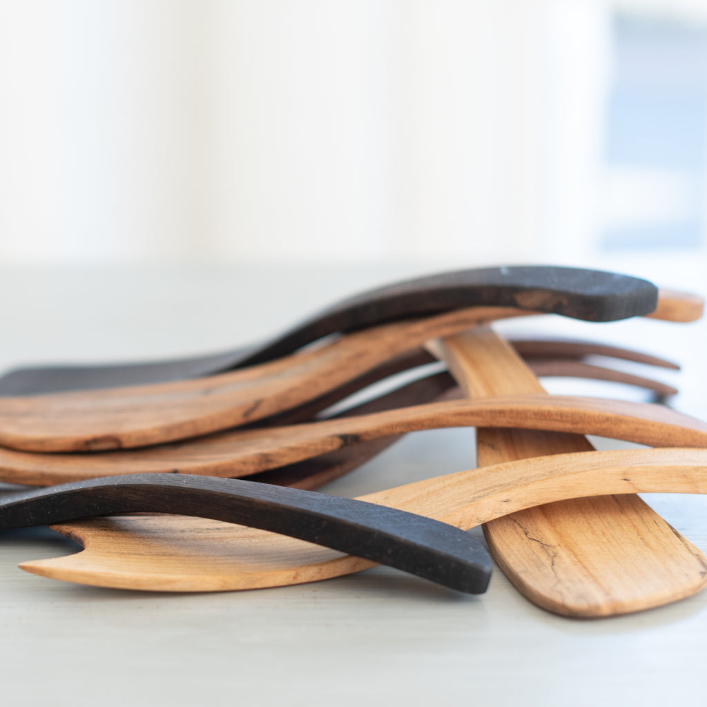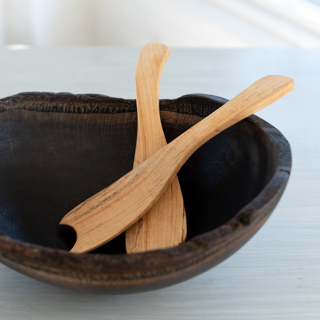 Toss leafy greens with a well-crafted, artisanal flair. These hand-made salad tossers have an elegant and slightly bowed shape. They are sustainably sourced, upcycled, and handcrafted in New England.