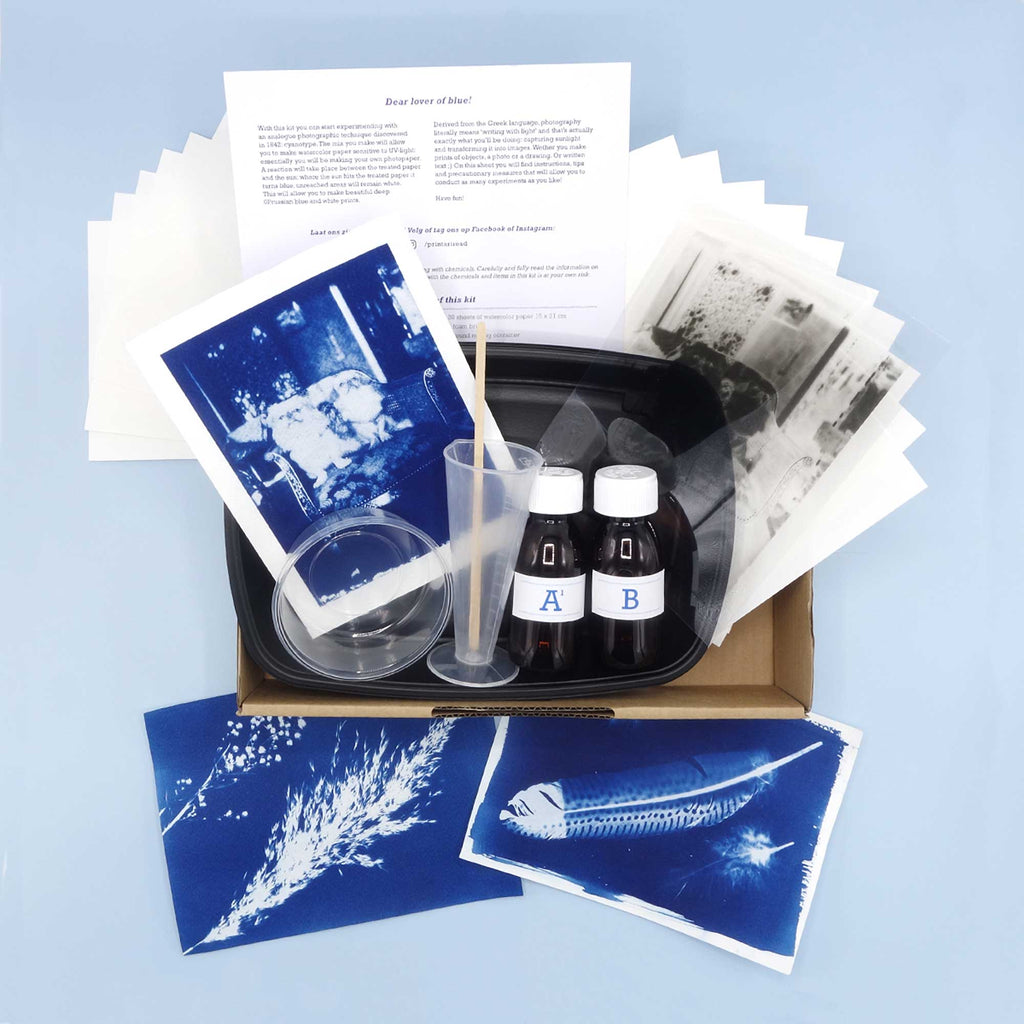 With the ingredients in this DIY Cyanotype Kit, you can transform watercolor paper into photo paper by making it UV-sensitive. Wherever the sun hits the treated paper, a dark blue color develops, also known as Prussian blue. This way, you can create blue-and-white prints at home. For example, you can print a photo on a sheet, draw on a sheet, or collect objects to place on the treated paper. Briefly expose it to the sun and you'll see the color change! With this kit, you can mix and apply the photo media yourself, enough for approximately 40 A4 sheets. So you can make enough mix to experiment further.