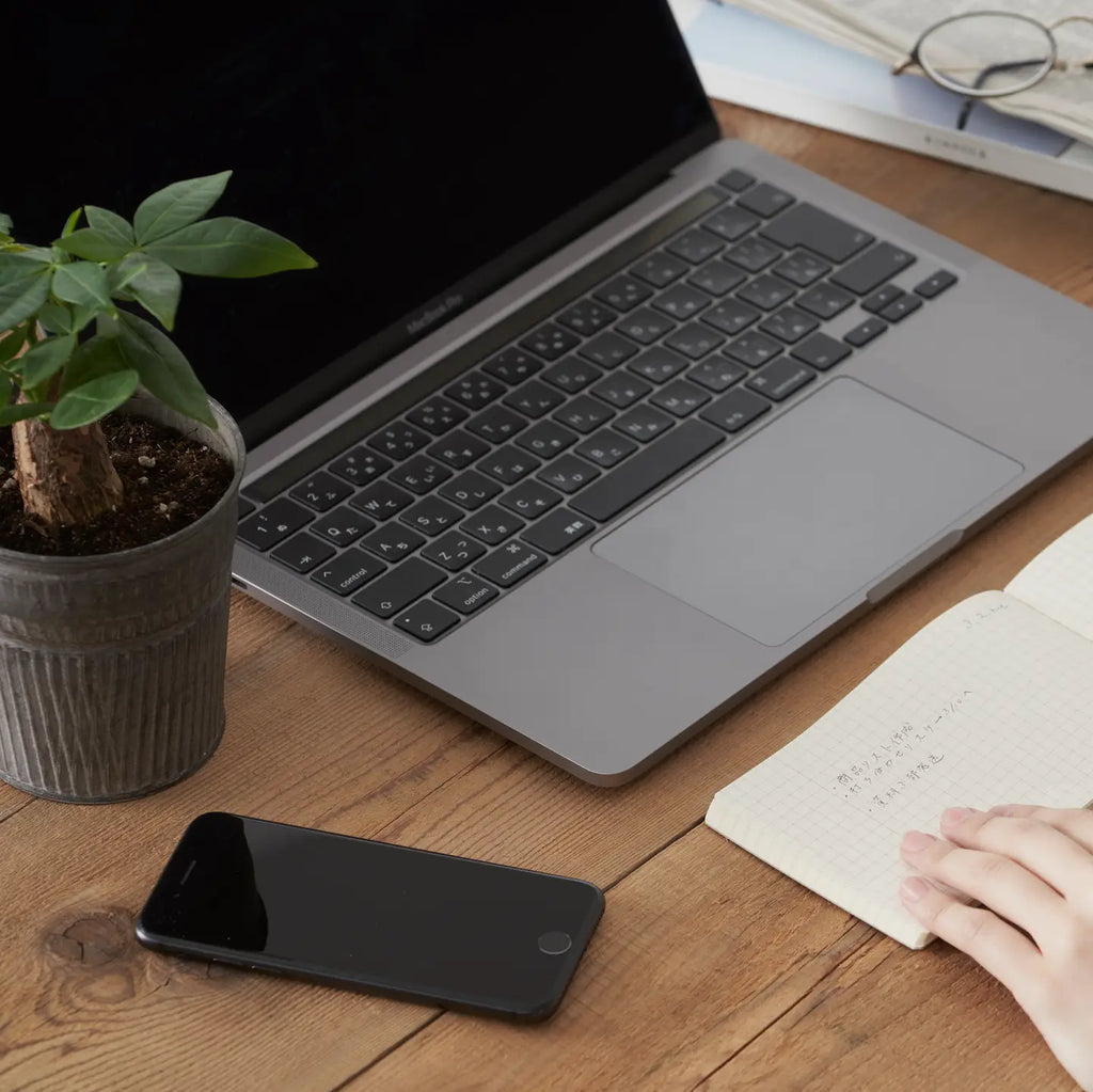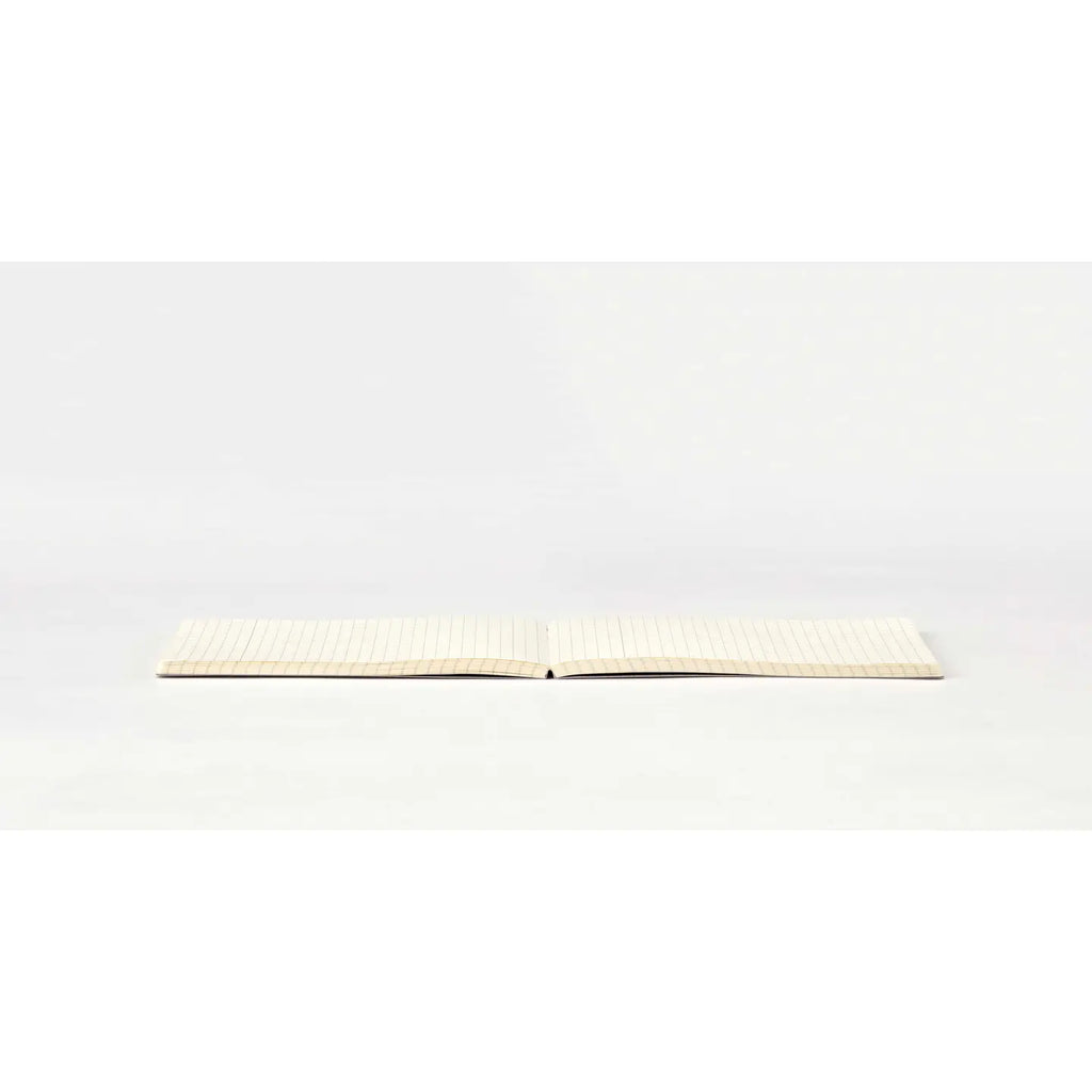 Designed to sit seamlessly beneath a 15-inch laptop. This landscape notebook is optimized for wider laptop setups, making it perfect for desk work, remote meetings, and café sessions. It fits neatly under a 15-inch PC, keeping notes and ideas right where you need them. When closed, it’s approximately B6 size—compact yet generous enough for detailed writing. The gray 5 mm grid layout includes a subtle composition line on the left for headings or structure, while remaining flexible for free-form use.